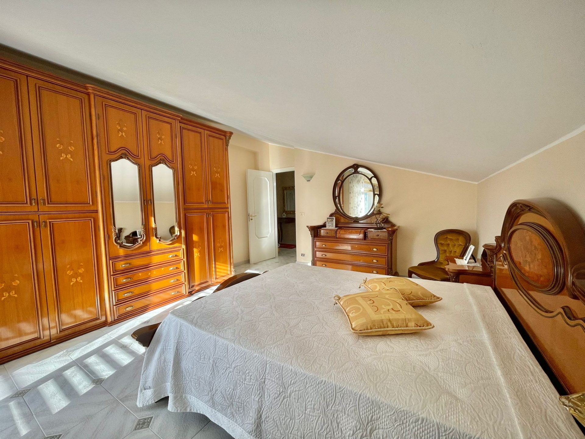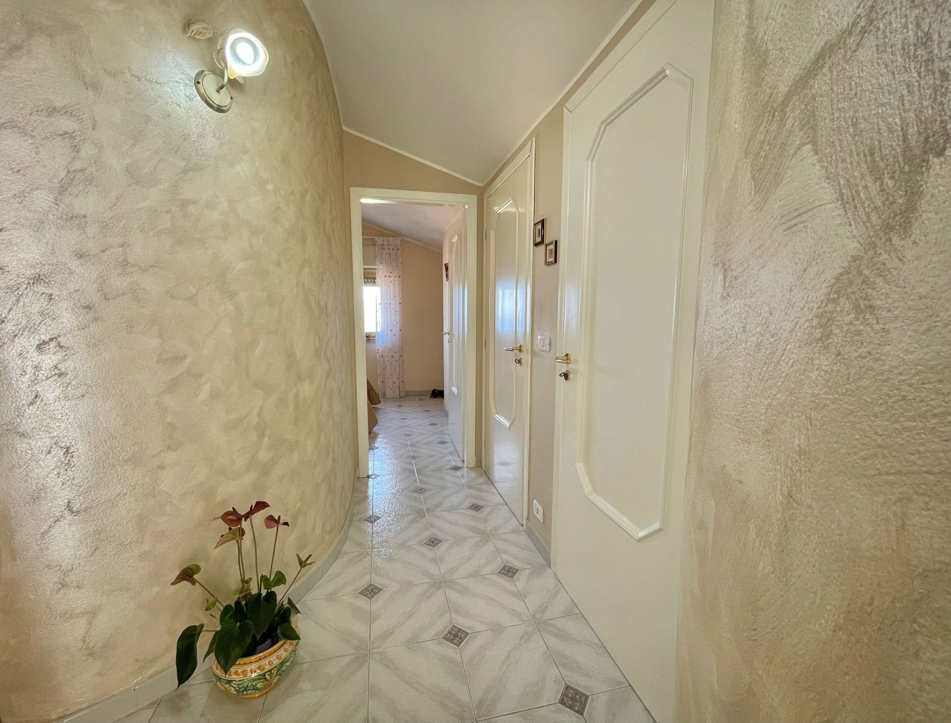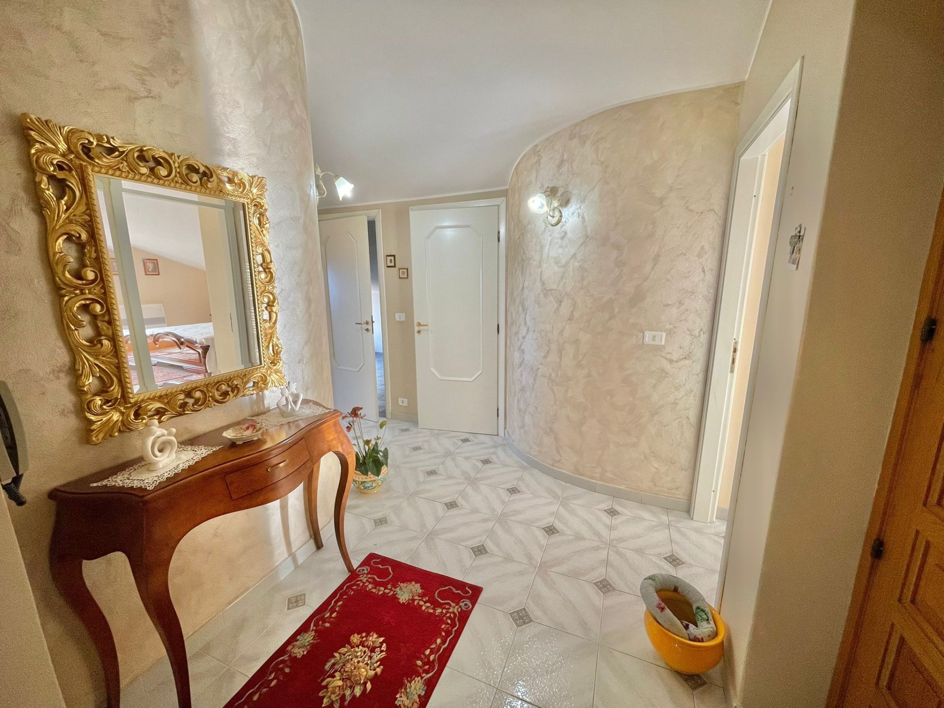 La proprietà è composta da sala d'ingresso, soggiorno, cucina, tre camere, wc- con vasca, lavanderia-wc, quattro balconi circondano l'immobile.